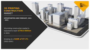 3D Printing Construction Market 3D printing construction market size was valued at $1.4 billion in 2021, and is projected to reach $750.8 billion by 2031, growing at a CAGR of 87.3%. WILMINGTON, DELAWARE, UNITED STATES, April 3, 2024 /EINPresswire.com/ — Surge in use of 3D printers in the construction industry for making precise final products,… Continue reading 3D Printing Construction Market is projected to achieve value of $750.8 billion 2031, reflecting a robust CAGR of 87.3%