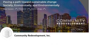 Community Redevelopment Inc. (OTC: CRDV) is a full-service real estate company with a management team that has extensive experience in acquiring, developing, constructing, and managing high-quality multifamily, and retail properties. CRDV is focused on all aspects of the urban real estate development cycle including land development, design-build, property operations, and site redevelopment. In addition to the ownership of our operating property portfolio, CRDV plans to develop and build desirable properties for its own account and/or through joint ventures with affiliated and unaffiliated partners.
